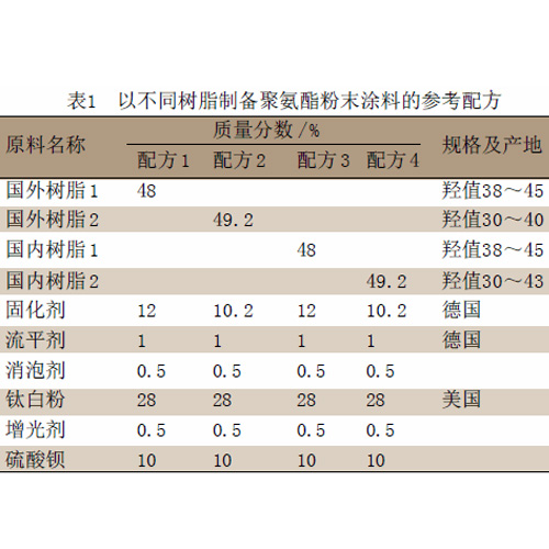 選取的飽和羥基聚酯有國外樹脂1、國外樹脂2 和國內樹脂1、國內樹脂2,作對比試驗。其參考配方見表1。