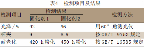 嚴格按照表2的試驗檢測條件對由表3配方制成的粉末涂料涂膜進行檢測,除耐老化、光澤、杯突有所變化外,其他的各種物理化學性能跟表2做對比都沒有變化。試驗結果見表4。
